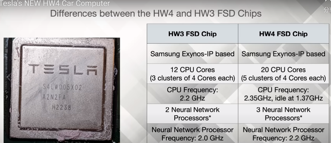 第一代FSD使用的是三星的14納米工藝。根據WikiChip的數據,三星7納米LPP HD高密度cell方案的晶體管密度高達95.08 MTr/mm2,而HP高性能方案的晶體管密度為77.01 MTr/mm2。相比之下,三星14納米UHP方案的晶體管密度為26.22 MTr/mm2,HP方案晶體管密度為32.94 MTr/mm2。基本上,三星7納米的晶體管密度是14納米的3倍以上。這意味著特斯拉的第二代FSD芯片可以容納更多的MAC陣列,從而實現AI性能的三倍提升。考慮到第一代FSD的AI性能為73.7TOPS@INT8,三倍的提升即為221.1TOPS。如果再結合稀疏模型加速技術,算力數字還可以再增長一倍。另外,根據推測,由于二代FSD芯片面積明顯大于一代,并且NPU增加到3個,因此其算力可能在500TOPS上下。