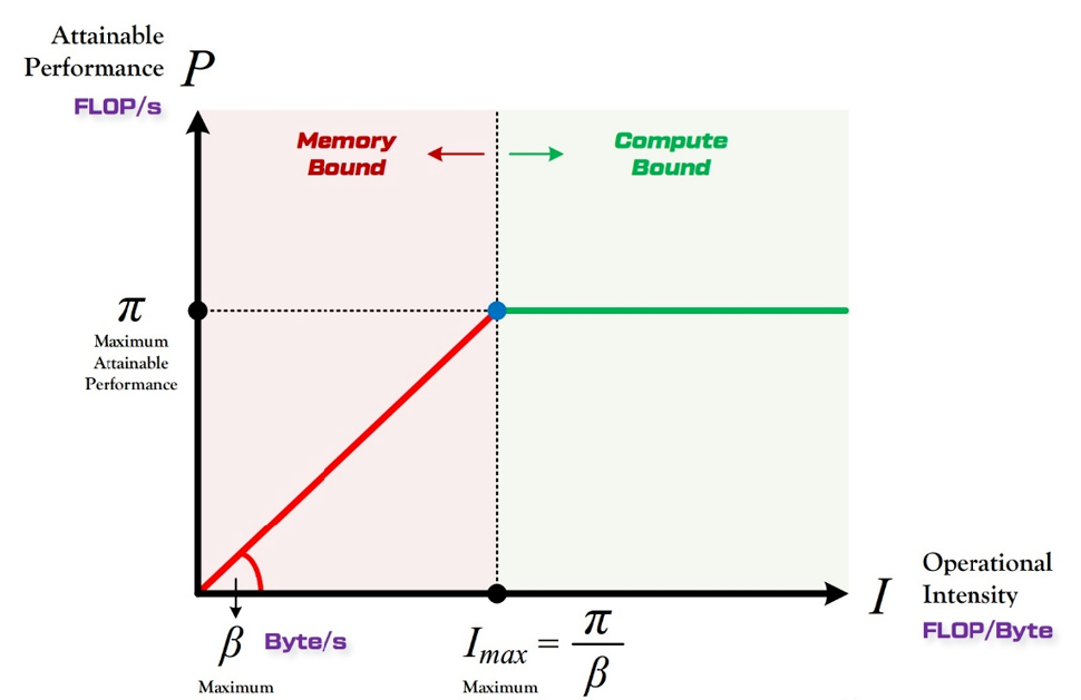 當計算平臺的利用率低于100%時,模型處于Memory-Bound狀態。在這個狀態下,模型的理論性能P完全由計算平臺的帶寬上限(房檐的斜率)和模型自身的計算強度I(Intensity)決定。因此,在帶寬瓶頸的前提下,計算平臺的帶寬越陡峭,或者模型的計算強度越大,模型的理論性能P可以呈線性增長。